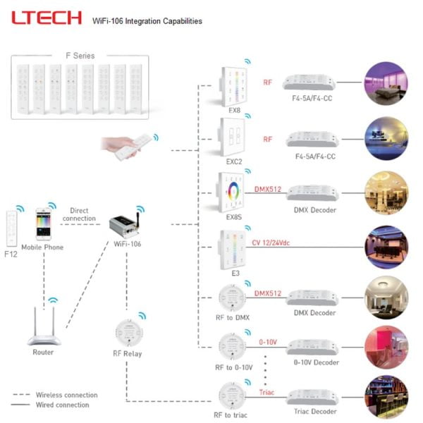 - All of our ‘E’ and ‘EX’ series touch panels can be added into this system offering the user fixed dedicated wall mounted control. The WIFI-106 controller and the ‘E’ or ‘EX’ series touch panels connect to the same wireless zone receivers. If the LED lights are connected to the touch panels by wire (DMX or low voltage cable); the WIFI-106 can control the ‘E’ and ‘EX’ series touch panel directly.