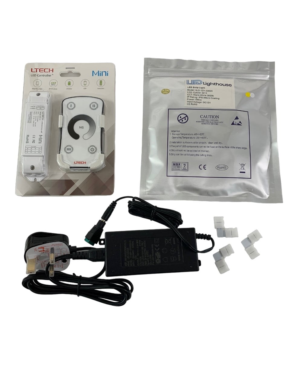 You will receive 5m of our 5 watt per metre LED strip light, a 36w plug-in LED power supply and our remote control LED strip dimmer with receiver. We also add 3 corner connectors in the kit, free of charge!