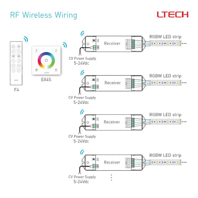 This controller can remotely control RGB or RGBW LED Strip by Radio Frequency or by wire using DMX512 signal. Wireless or DMX control receivers are required (available to buy below). Multiple zone control receivers can be used however each zone receiver can’t be controlled individually, they are controlled together and remain perfectly synchronised with each other.