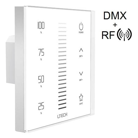 Wireless or wired DMX single zone wall mounted LED strip dimmer, touch sensitive glass screen