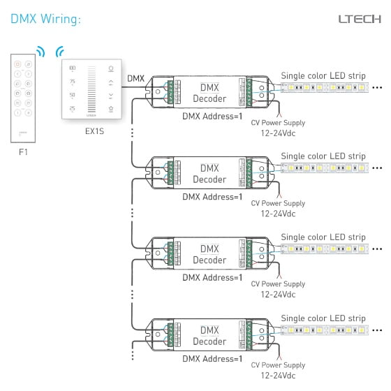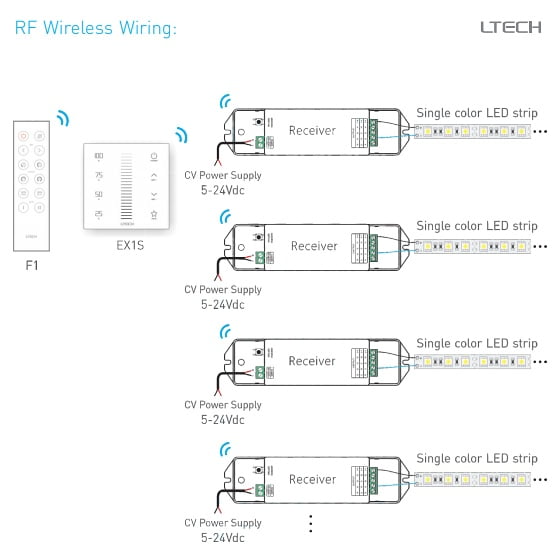 This dimmer can remotely control white or single colour LED Strip by Radio Frequency or by wire using DMX512 signal. Wireless or DMX control receivers are required (available to buy below). Multiple zone control receivers can be used however each zone receiver can’t be controlled individually, they are controlled together and remain perfectly synchronised with each other.