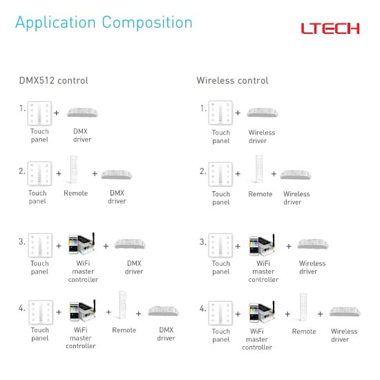 Control Receivers: This control panel transmits a wireless RF and DMX512 control signal. The signal is received by control receivers (available to buy separately, see ‘matching items’ below) which then control the LED lights. Choose either a wired connection using DMX receivers or wireless connection using F4-5A receivers or a mixture of both. Multiple receivers can be added.