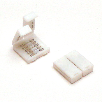 This connector is used to connect two lengths of our RGBW colour changing LED strip together. The LED strip light must be 12mm wide to use this connector. Before this connector can be used, gel waterproof coatings must be removed 7mm from the end of both LED strips. The LED strip can then slide inside the connector, passing under the metal arms. Ensure the arms are pushing down onto the copper contacts of the LED Strip. Then close the connector cover, ensuring the teeth clamp directly onto the circuit board of the LED strip not the gel coating.