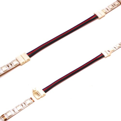 This connector is used to connect two lengths of RGB colour changing LED strip together. The LED strip light must be 10mm. Before this connector can be used, gel waterproof coatings must be removed 7mm from the end of both LED strips. The LED strip can then slide inside the connector, passing under the metal arms. Ensure the arms are pushing down onto the copper contacts of the LED Strip. Then close the connector cover, ensuring the teeth clamp directly onto the circuit board of the LED strip not the gel coating.